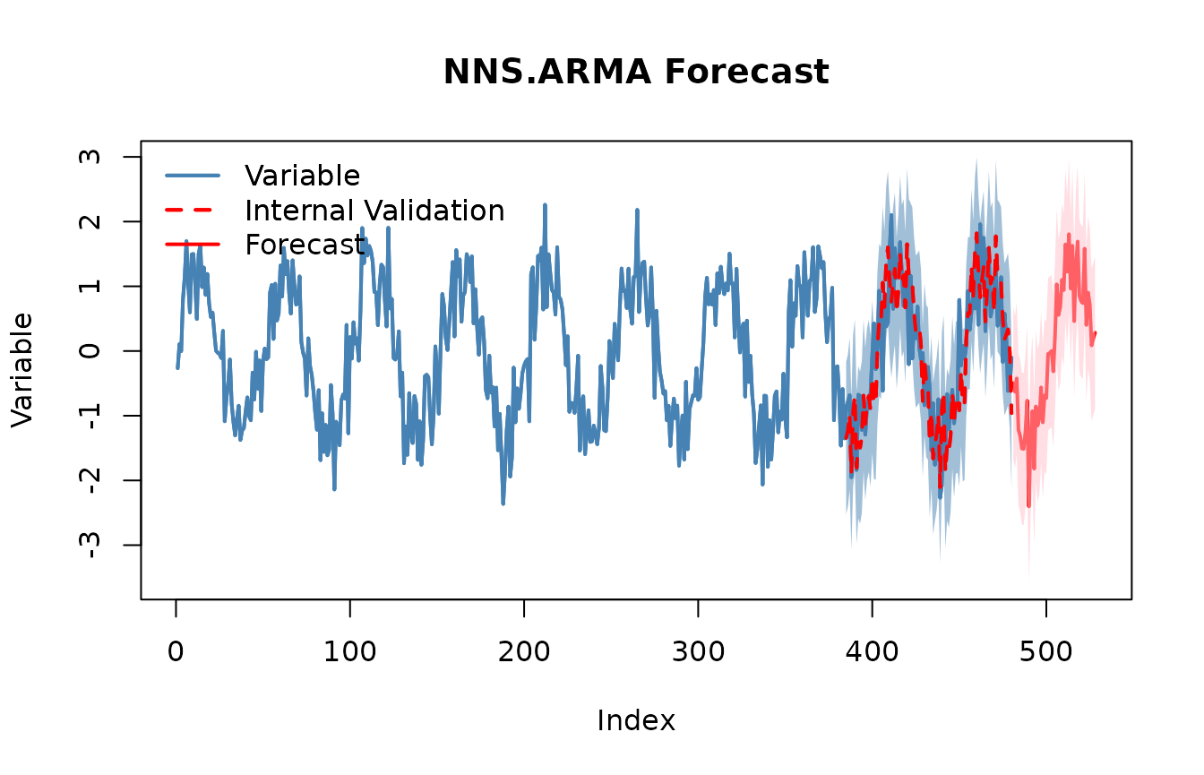 Notes. NNS seasonality uses coefficient of variation instead of ACF/PACFs, and NNS ARMA blends multiple seasonal periods into the linear or nonlinear regression forecasts.